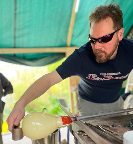 Phil has continued to push his aesthetic in the direction of the American Studio style, creating vivid expressions of the delicate beauty and intricate detail found in natural forms. His work embraces the fundamentally unknowable outcomes of glass blowing, allowing and encouraging randomness, asymmetry and surprise. Sharing a great deal in common with ceramics, he balances and manages gravity, rotation, heat and time, encouraging a piece towards his vision but also allowing it to take its own direction.
